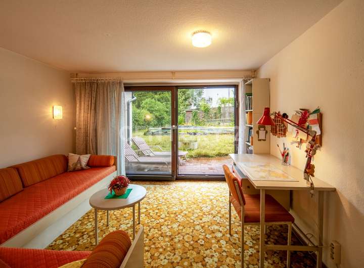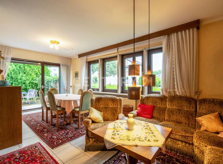 Das helle, gemütliche Wohnzimmer, mit Zutritt auf den großzügigen Terrassenbereich, ermöglicht den Übergang in den großen Garten auf Erdgeschossebene - barrierefrei!