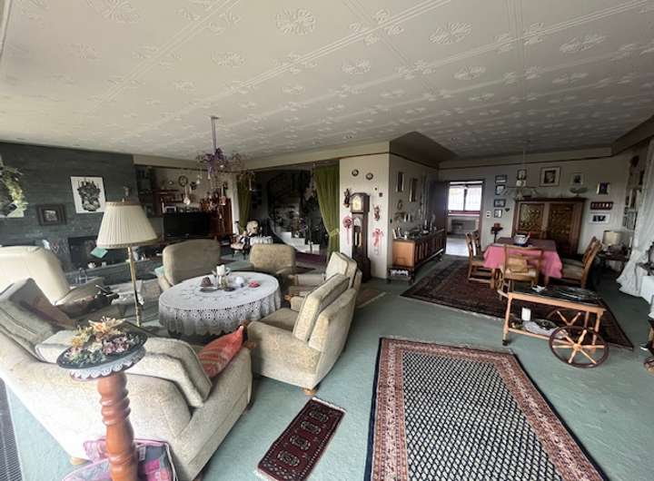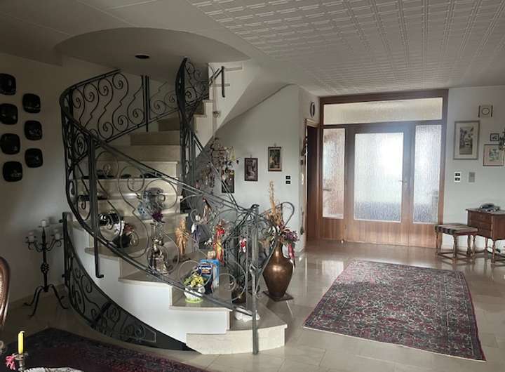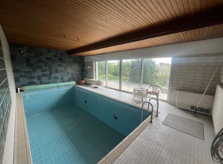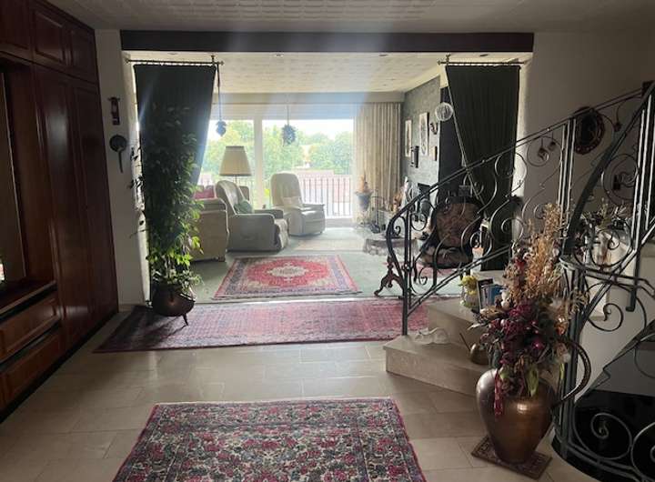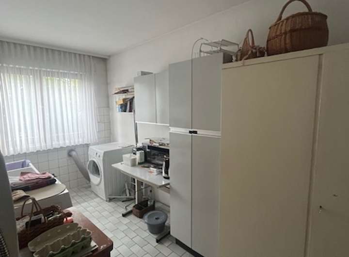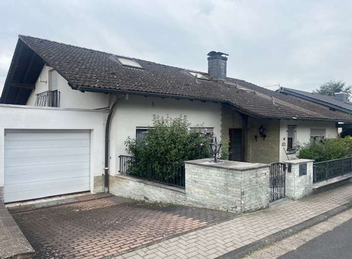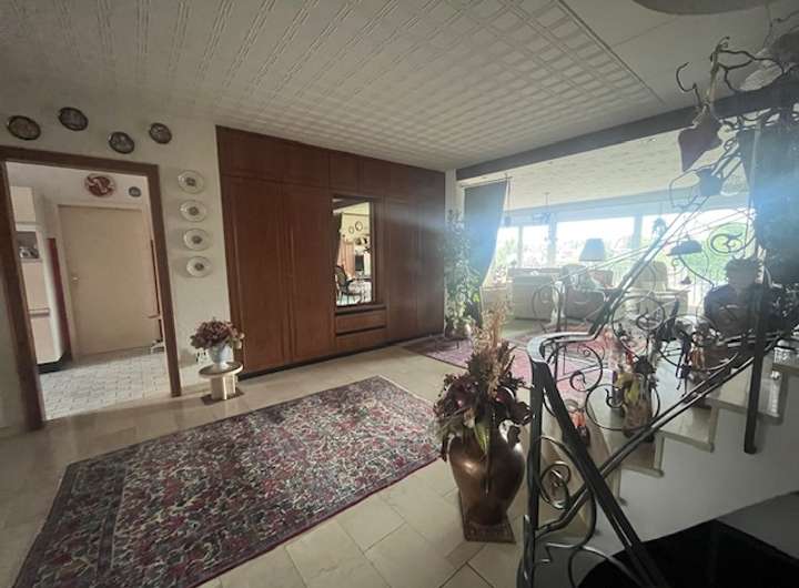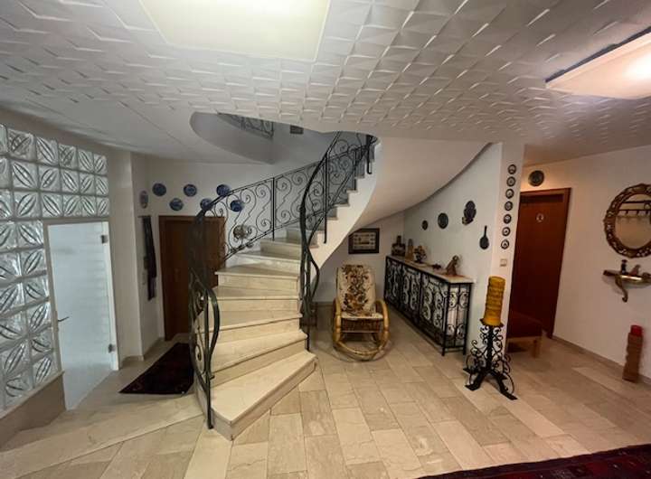 Dieses 1973 gebaute und an einem Hang gelegene Architektenhaus besticht durch seine großzügige und damals schon durchdachte Aufteilung und unverbaubaren Ausblick über Ostheim. Durch den Haupteingang gelangen Sie in einen Windfang der beide Wohnteile trennt. Von hier gelangen Sie in das Erdgeschoss. Es empfängt Sie ein sehr großer Entree mit Einbauschränken, Zugang zum Gäste-WC sowie einer repräsentativen Marmortreppe die in das Untergeschoss führt. Auf dieser Ebene befinden sich weiterhin eine Küche mit angeschlossenen Hauswirtschaftsraum sowie ein offen gestaltetes Wohn- und Esszimmer. Vom großen, offene Wohnzimmer mit Kamin aus genießen Sie durch die komplette offene Fensterfront einen einmaligen Blick über Ostheim. Der Schlaftrakt, bestehend aus Schlafzimmer, Ankleide und Badezimmer, rundet diese Wohneinheit ab. Ein über die gesamte Hausbreite verlaufender Balkon lädt zum Verweilen und Genießen ein. In das Untergeschoss gelangen Sie über die große Marmortreppen direkt in einen großen Flur mit Marmorböden. Von hier aus betreten Sie ein Gästezimmer, einen Vorratskeller mit angeschlossenen Weinkeller sowie ein weiteres Gäste-WC sowie den Heizungsraum. Als Highlight des Untergeschosses erwartet Sie zu dem Kellerraum mit Warenaufzug (der als Weinkeller genutzt wurde) zur darüberliegenden Garage u.a. noch die große, innenliegende und beheizbare Schwimmhalle sowie ein weiterer Wohn-, Büro / Partyraum jeweils mit großen Schiebetüren und Zugang zu der sich über die gesamte Hauslänge erstreckende Terrasse mit Kamin und den Garten.