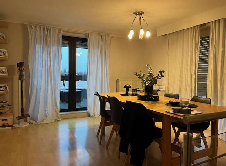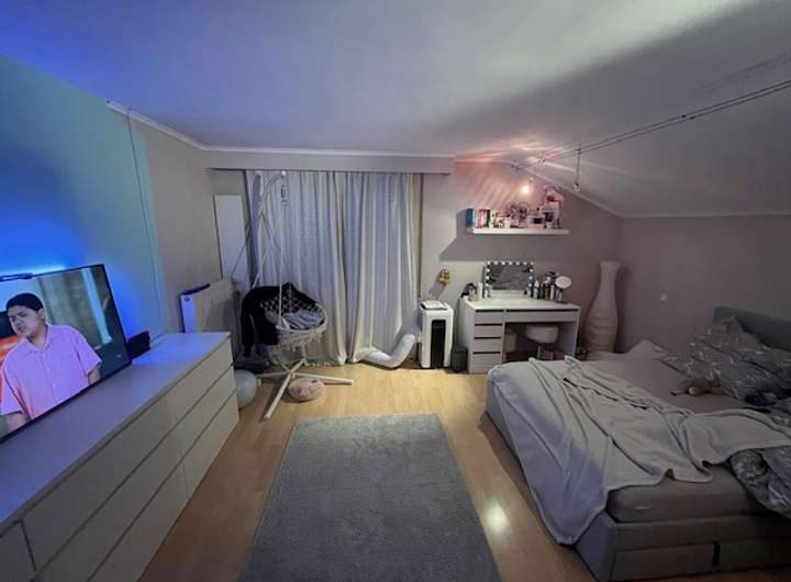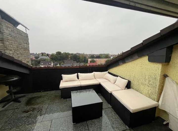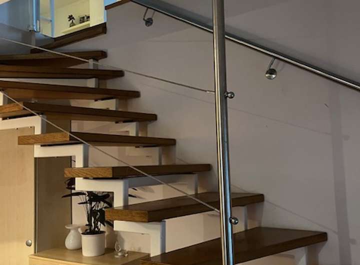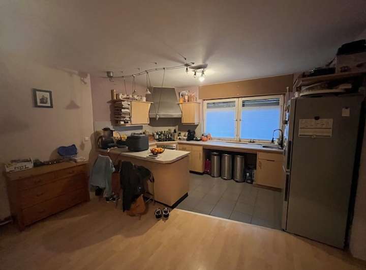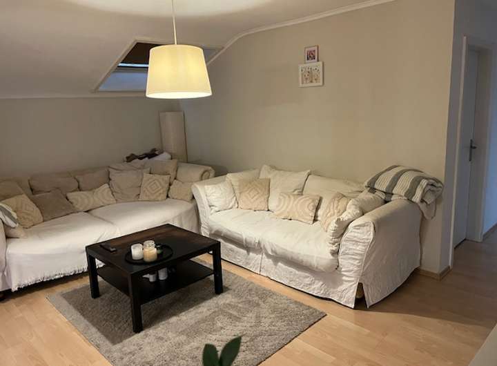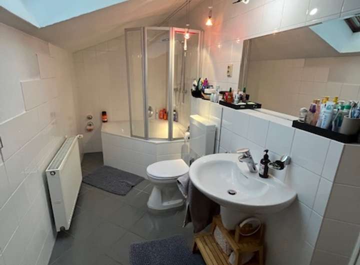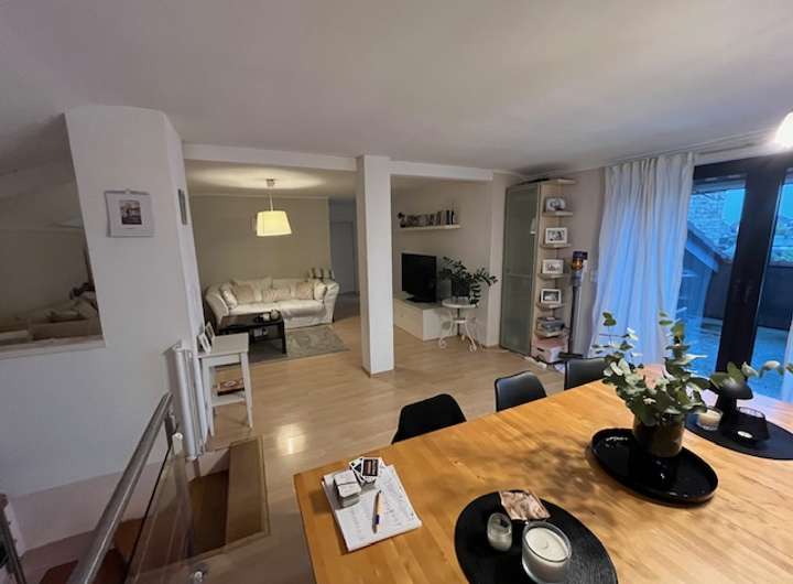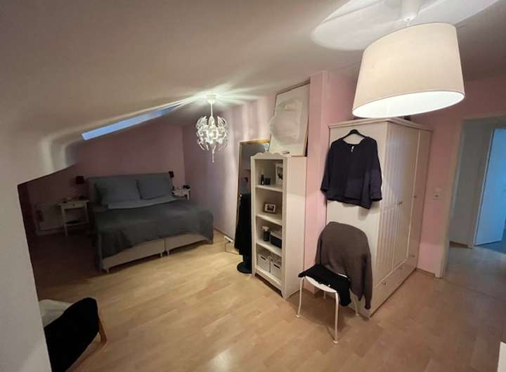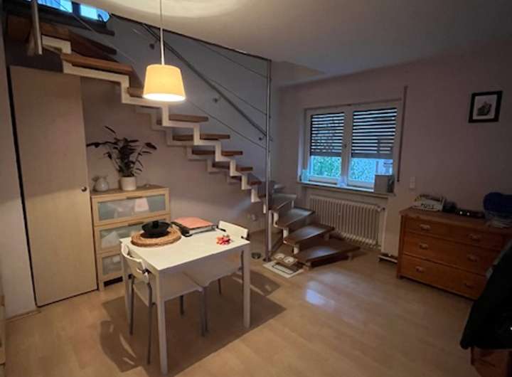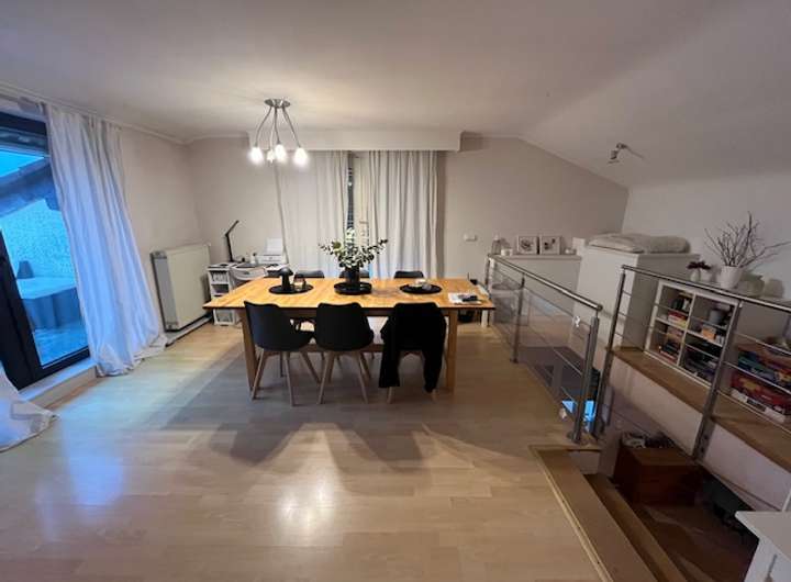 Die zweite Wohnung, welche sich über einen Teil im Erdgeschoss und den gesamtem Teil um Dachgeschoss erstreckt, gelangen Sie ebenso durch den Haupteingang. Durch einen Flur mit Garderobe und Zugang zum Gäste-WC gelangen Sie in den offenen Ess- und Küchenbereich. Von hier aus führt eine offene Treppen in das Obergeschoss. Auch hier erwartet Sie in großer, loftähnlicher Wohn- und Essbereich mit Dachloggia. Aus diesem Bereich gelangen Sie in das Badezimmer sowie in das Schlafzimmerzimmer und Kinderzimmer.
