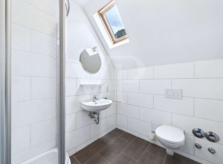 Das Obergeschoss bietet ca. 54 Quadratmeter Wohnfläche, verteilt auf zwei Zimmer, Küche mit Einbauküche und ein modernes Duschbad. Ein kleiner Balkon sorgt hier für zusätzlichen Wohnkomfort und eine angenehme Rückzugsmöglichkeit im Freien.