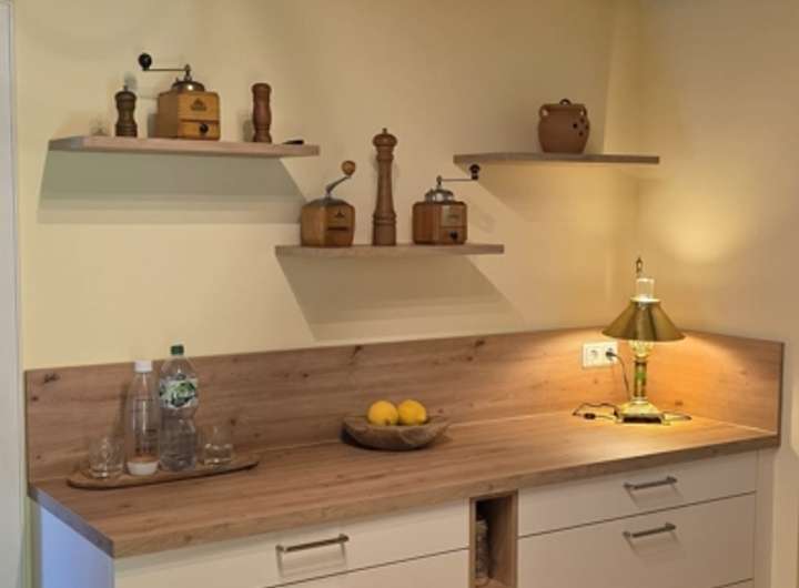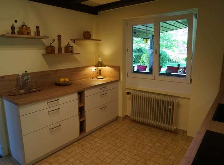 - Landhausküche mit Tisch u. Sitzgelegenheit