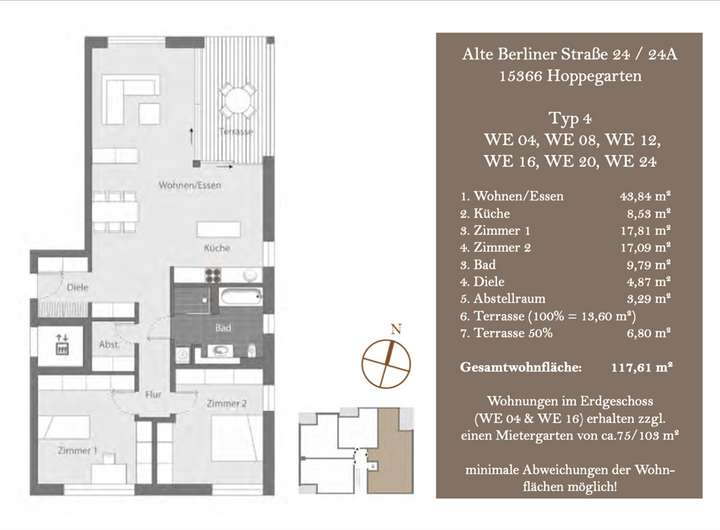 Die zwei Gebäude verfügen über je 12 Wohneinheiten, insgesamt also 24 Wohneinheiten. Die beiden Häuser sind baugleich und bestehen jeweils aus 9 Zwei-Zimmerwohnungen mit Wohnungsgrößen von ca. 56 qm bis ca. 67 qm Wohnfläche und je 3 Drei-Zimmerwohnungen mit Wohnungsgrößen von ca. 118 qm Wohnfläche.