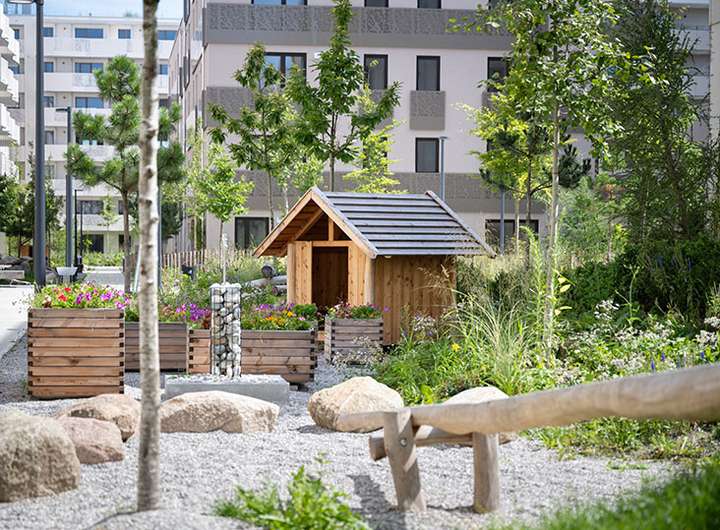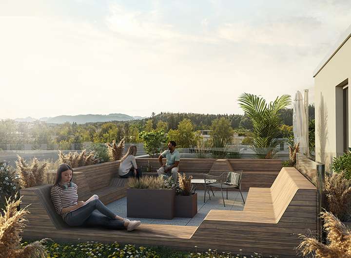 SILVA, der erste Bauabschnitt von OPUS.G, ist geprägt durch den Waldplatz, ein mit heimischen Bäumen und durch harmonische Freiflächen gekennzeichnetes Areal.