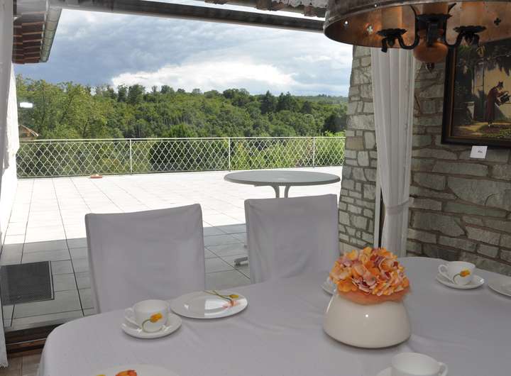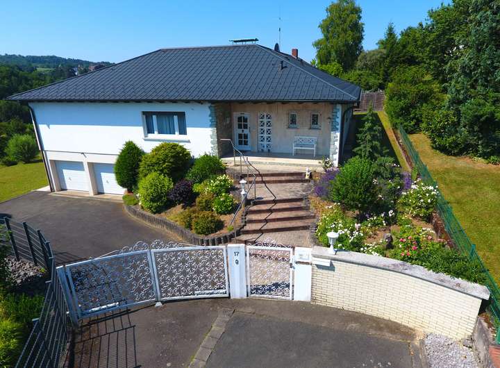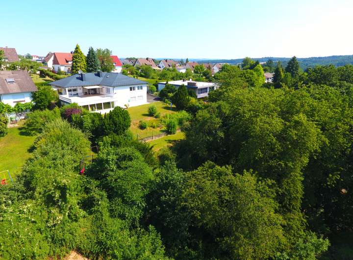 Im Erdgeschoss gelangt man in den Wohnbereich mit Esszimmer und Wohnzimmer. Von beiden Bereichen schauen Sie in die Weiten des Braunfelser Waldes. Vom Wohnzimmer geht man auf die große, teilüberdachte Terrasse mit großer, elektrischer Markise und Außenkamin. Von hier aus gelangt man auch in den Garten.