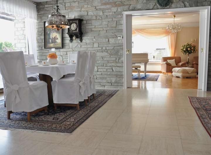 Das Wohnzimmer ist mit hochwertigem Parkettboden ausgestattet, ergänzt durch elegante Fliesen im Flur und Badezimmer, unterstreichen den gepflegten Zustand des Hauses.
