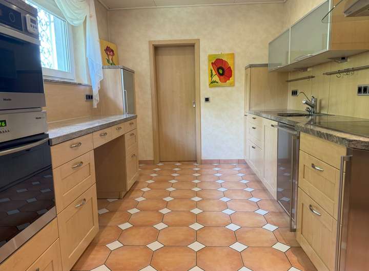 Auf der Erdgeschoss-Ebene befindet sich auch die Küche, mit hochwertigen Einbaugeräten und maßangefertigter Granit-Arbeitsplatte. Hinter der Küche ist noch ein praktischer Vorratsraum.