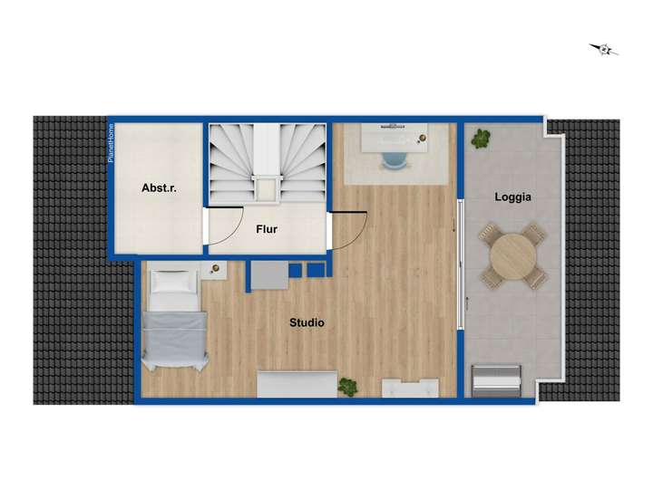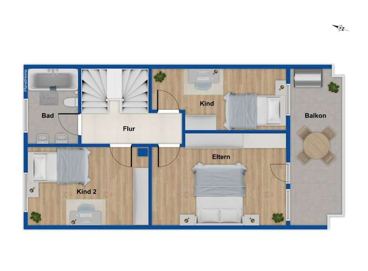 Zwei der Zimmer haben einen Zugang zum großzügigen Balkon. Über das Obergeschoss gelangen Sie in das Dachstudio, das sich hervorragend als Homeoffice, zusätzliches Kinderzimmer oder großzügiges Elternschlafzimmer eignet.
