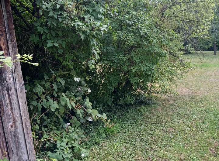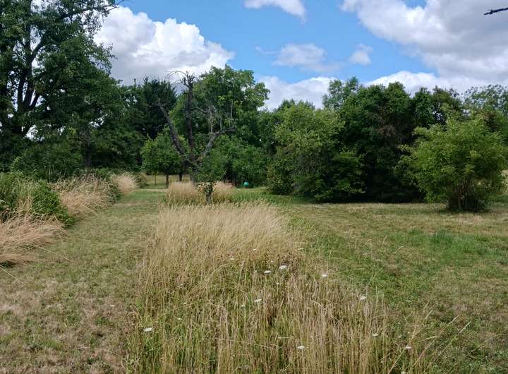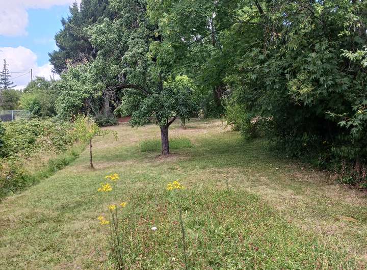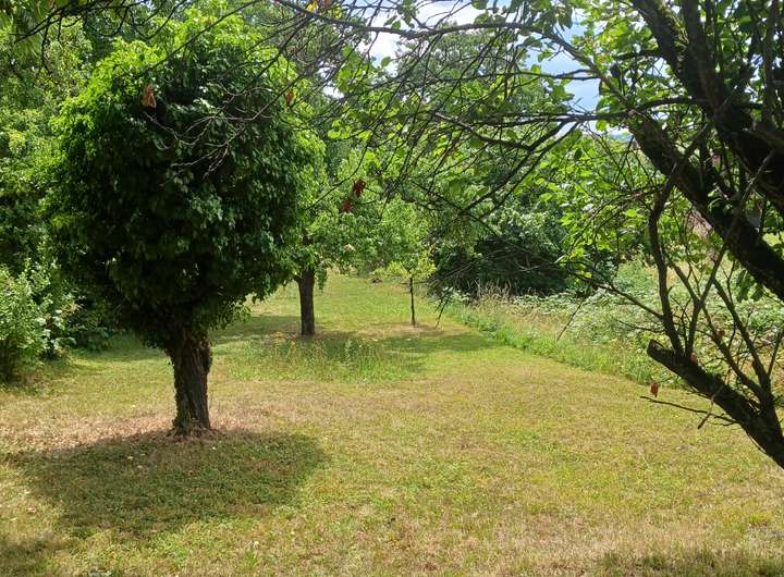 Es gibt verschiedene Obstbäume, die für eine schöne und ertragreiche Atmosphäre sorgen, sowie eine Rasenfläche, die zum Entspannen und Spielen einlädt.