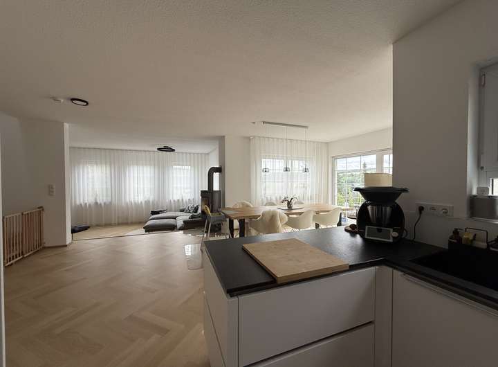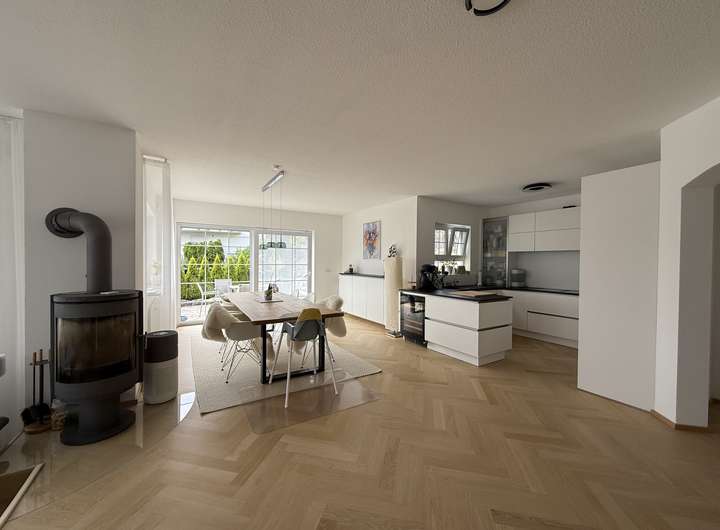 In den Hauptwohngeschossen (EG & OG) ist ein schöner Eichenparkett sowie heller Naturvinylboden verlegt. Die maßgefertigte Einbauküche mit Steinarbeitsplatte und High-End-geräten lässt keine Wünsche offen. Der gemütliche Kaminofen im Wohnzimmer rundet das behagliche Wohngefühl perfekt ab.