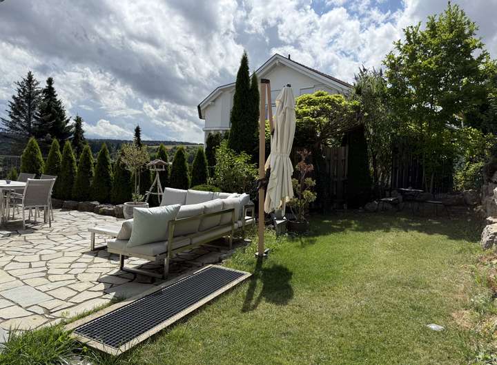 Der nach Südwesten ausgerichtete Garten bietet viel Sonne, Ruhe und einen malerischen Ausblick ins Grüne. Ob Gartenmöbel, Kinderspielgeräte, Gemüseanbau oder Wellnessoase – dieser Außenbereich lässt keine Wünsche offen.