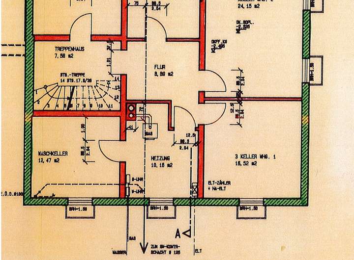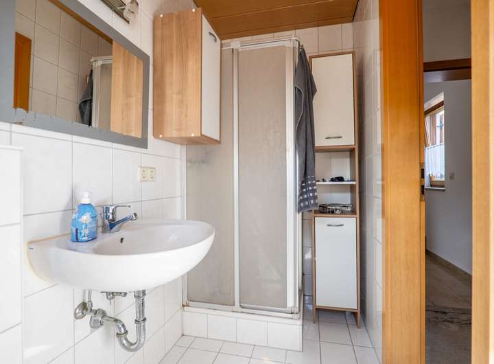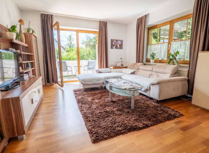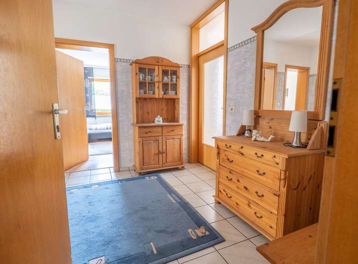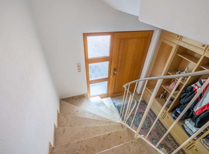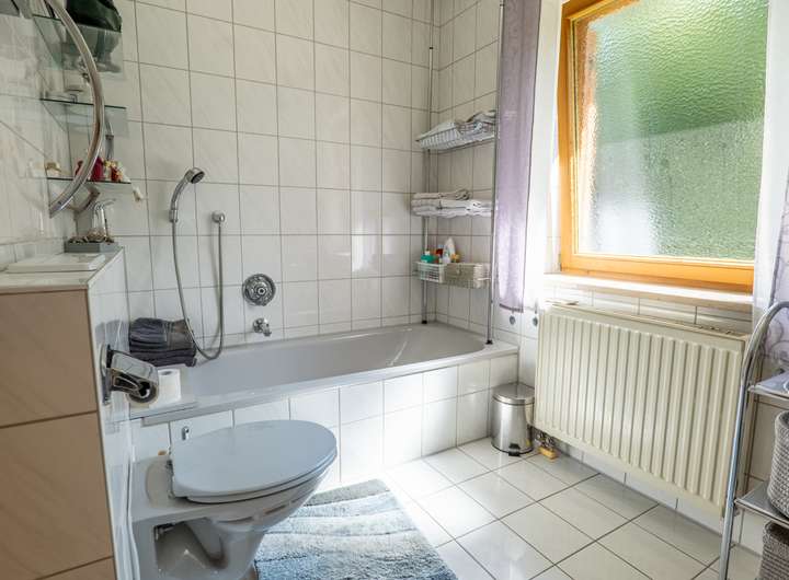 Im Erdgeschoss befindet sich eine 4 Zimmer Wohnung, Badezimmer mit Wanne und Dusche, Zugang zum Balkon über das Wohnzimmer und 2 der Schlafzimmer.