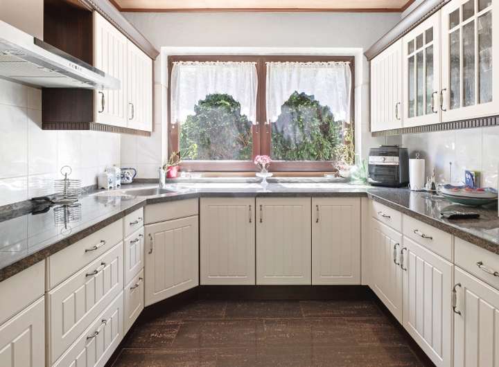 Es empfängt Sie eine gemütliche Eingangsdiele mit separatem Gäste-WC. Von hier aus gelangen Sie in das geräumige Esszimmer mit viel Platz für die große Familie. Angrenzend empfängt Sie die cremeweiße Landhausküche, die ländlichen Charme mit moderner Funktionalität vereint. Die Granit-Arbeitsfläche bietet reichlich Platz zum Zubereiten, Kochen und Servieren – robust, pflegeleicht und ein echter Blickfang. Die Markengeräte sind harmonisch in das Küchendesign integriert.