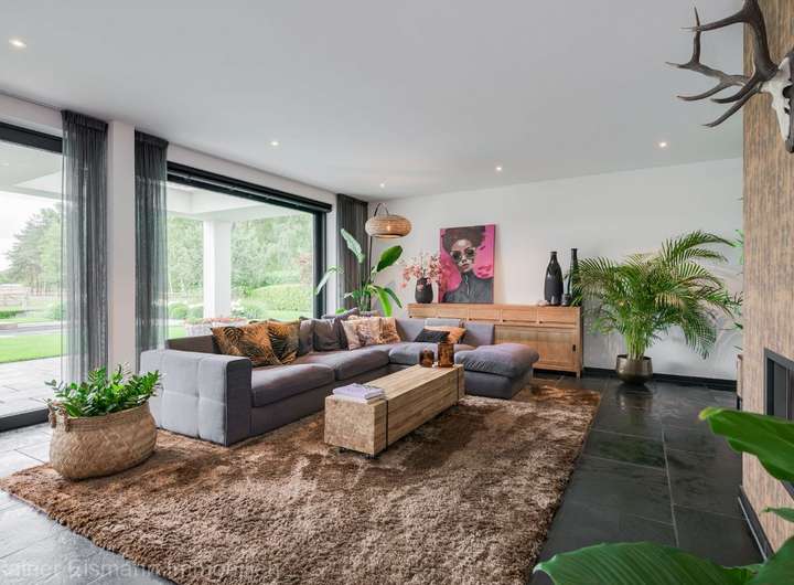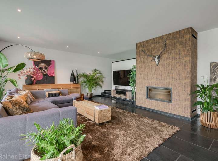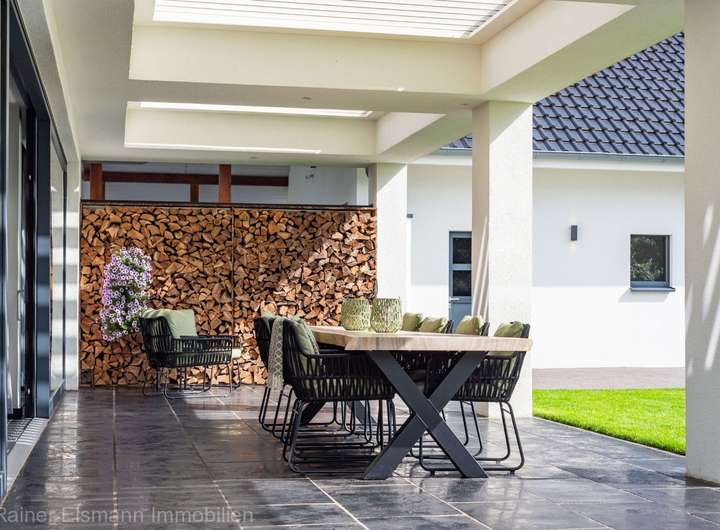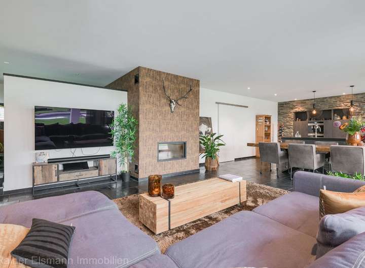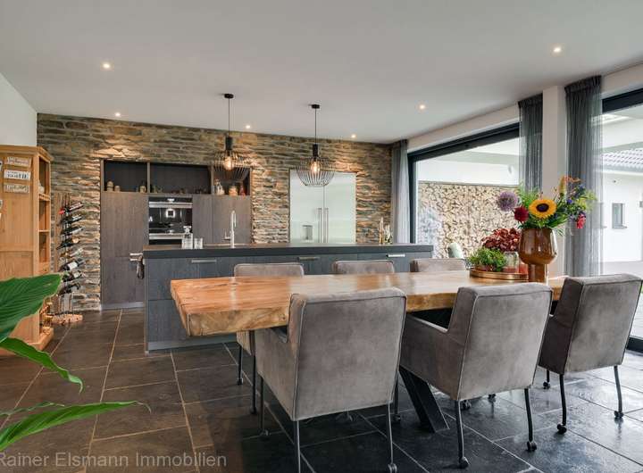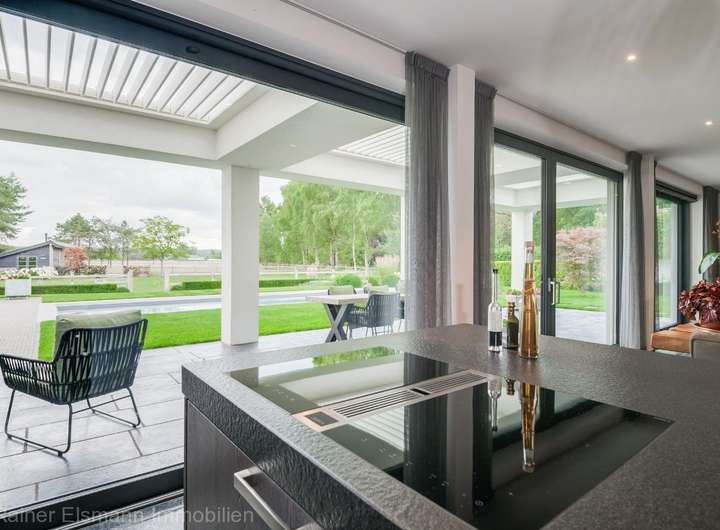 - Lichtdurchfluteter Raum mit raumhoher Glasfront und großformatigen Schiebetüren, die direkten Zugang zur überdachten Terrasse mit Lamellendach bieten. Die hochwertige Küche ist ausgestattet mit modernen Einbaugeräten und großem Kochinsel. Gemütlicher Wohnbereich mit 12 kW Holzofen und erhöhtem Bürobereich mit Blick auf die Straße.