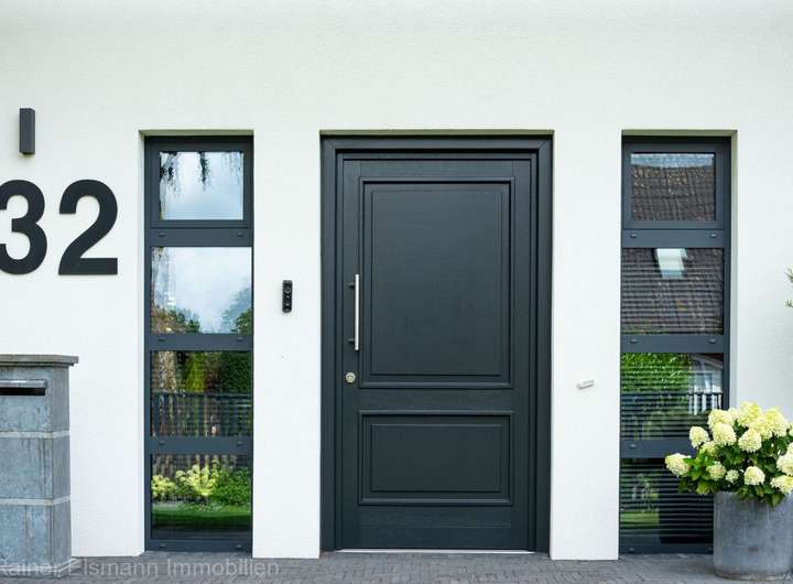 Das Anwesen verfügt über eine großzügige, breite Zufahrt mit Platz für mehrere Fahrzeuge. Ein gepflegter Vorgarten mit hochwertigem, pulverbeschichtetem Edelstahlzaun und elektrischer Zufahrtstor rundet den ersten Eindruck ab.