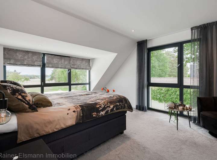 - Hauptschlafzimmer mit Doppelbett und begehbarem Kleiderschrank – traumhafter Blick über das gesamte Grundstück