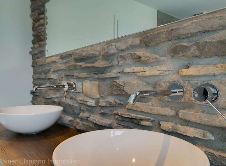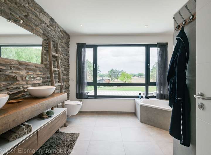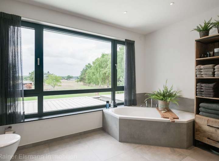 - Lichtdurchflutet mit Panoramablick auf das Grundstück. Ausgestattet mit Badewanne, großer begehbarer Dusche, WC und stilvollem Doppelwaschtisch.