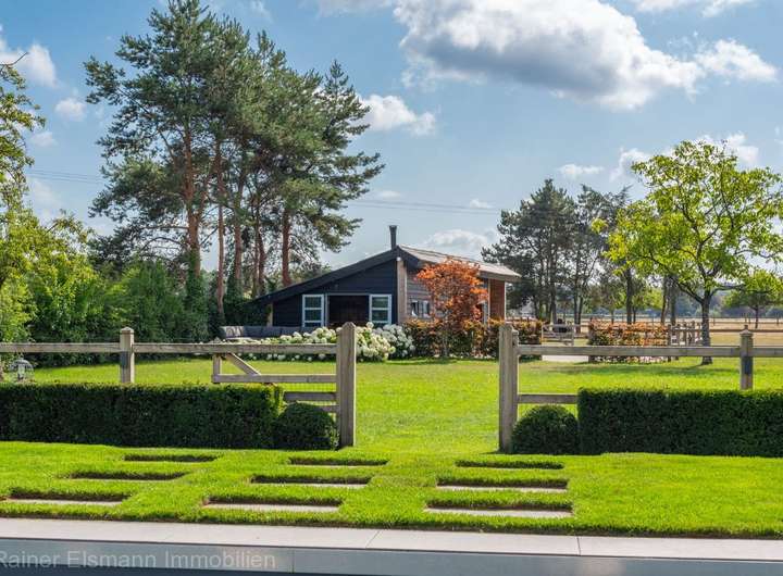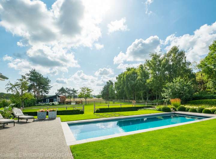 Erst hinter den stilvollen Toren offenbart sich der wahre Luxus: Eine liebevoll gestaltete, ruhige Gartenanlage mit mehreren Sitzbereichen, einem überdachten Terrassenbereich und einem großen, beheizten Pool mit traumhaftem Ausblick auf die fast 5.000 m² große, umzäunte Obstwiese.