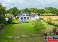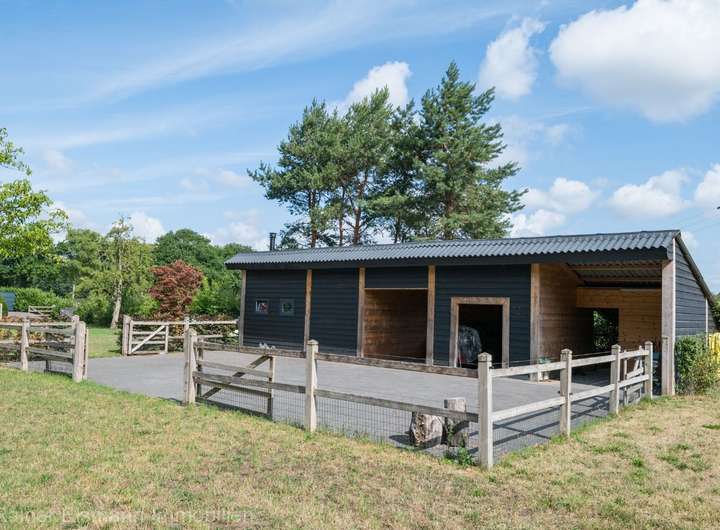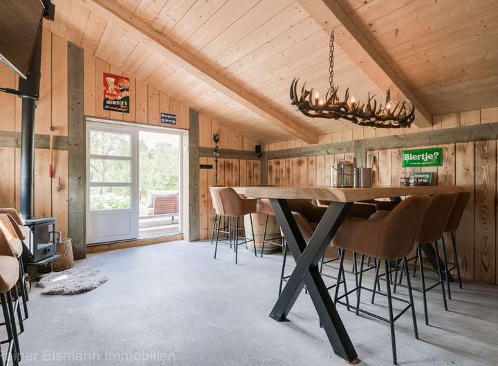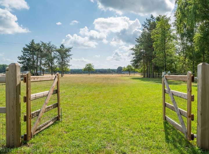Am vorderen Bereich der renovierten Scheune lädt eine Außenterrasse zum Verweilen ein. Im rückwärtigen Teil bietet die Scheune Platz für Pferdehaltung mit Offenstall und Paddock.