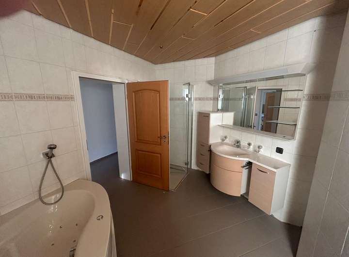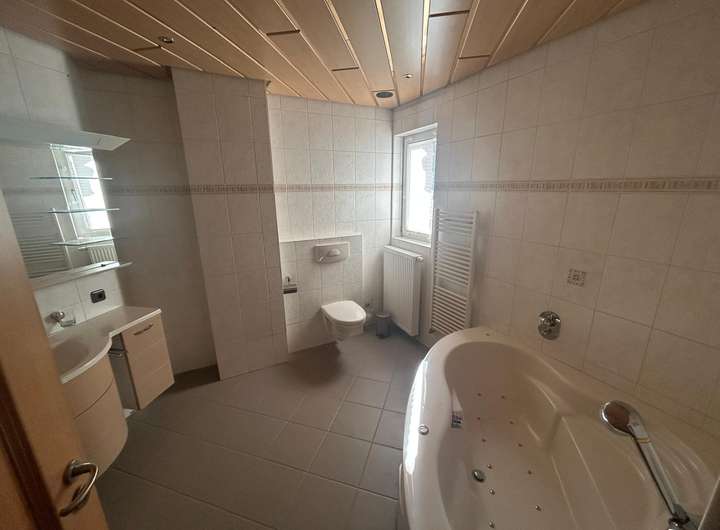 Wellnessbereich: Ein Haupt-Badezimmer mit Wellnessbadewanne und Saunaanschluss sorgt für absolute Entspannung.