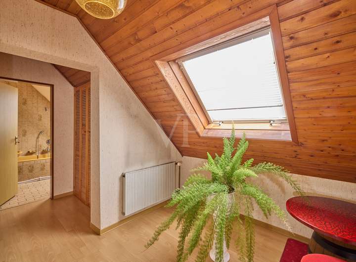 Das Dachgeschoss erwartet Sie mit einem hellen Zimmer mit direktem Zugang zum Balkon, einem Tageslichtbad mit Wanne und einer zusätzlichen Küche, das sich ideal durch die vorhandene abschließbare Tür vom Treppenbereich als Gästeparadies anbietet.