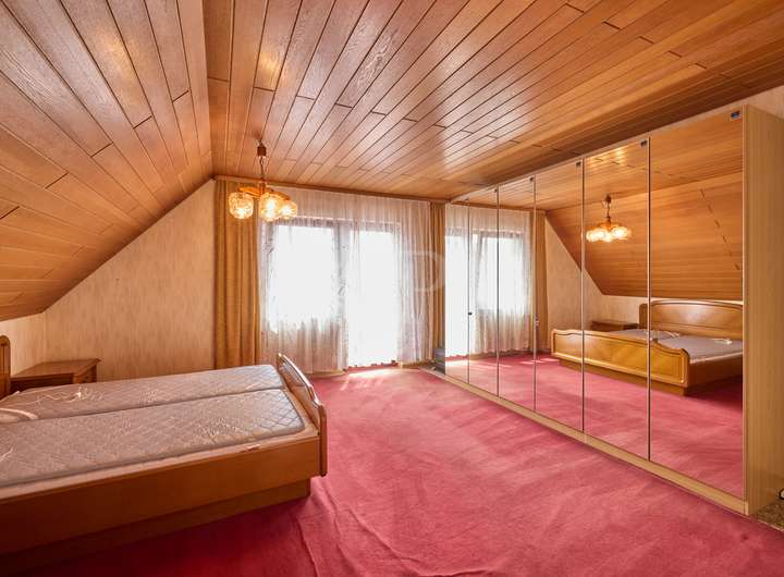 Über eine Treppe erreichen Sie das geräumige Obergeschoss des Hauses. Hier befinden sich zwei ansprechende, helle Zimmer mit Zugang zum sonnigen Balkon, die Ihnen zur individuellen Nutzung zur Verfügung stehen. Ergänzt wird das gelungene Raumkonzept auf dieser Etage durch ein weiteres Zimmer sowie ein Tageslichtbad mit Badewanne, Dusche und Bidet.
