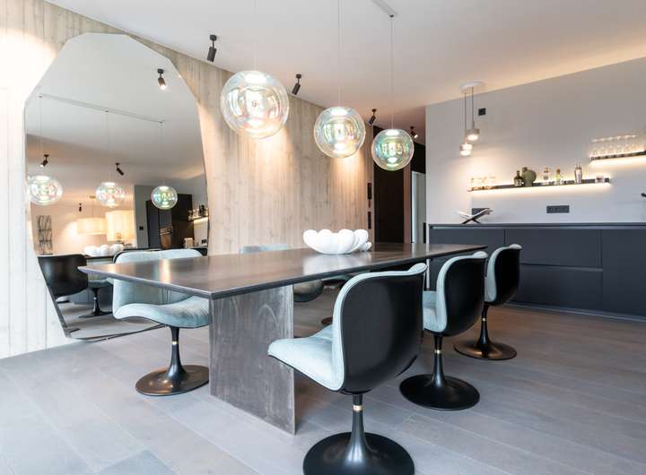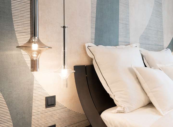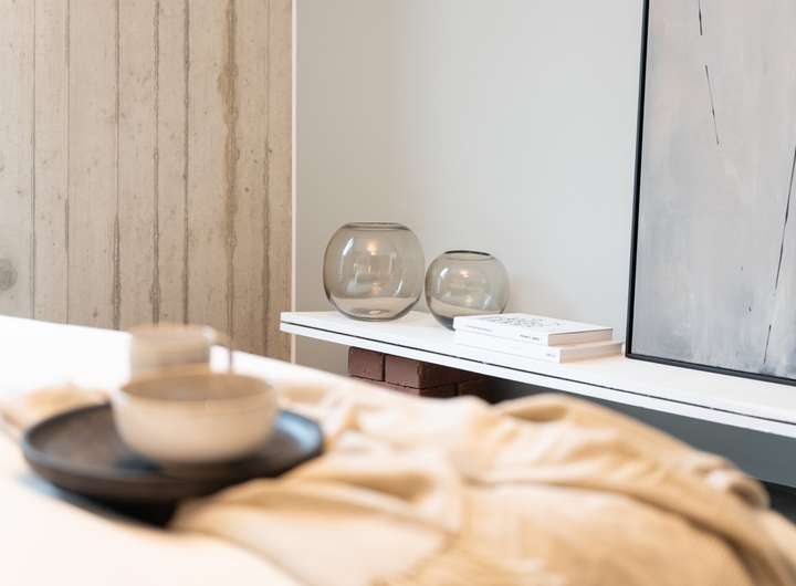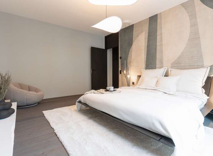 Die Innenwände sind aus sichtbarem Beton und haben eine Holzoptik, die für ein warmes und gemütliches Ambiente sorgt. Deckenhohe Holztüren, Holz- und Steinböden, eine hochwertige Badausstattung mit vom Tischler ausgearbeiteten Waschtischen und ebenerdigen Duschen runden den hohen Anspruch an maximalen Komfort und Luxus ab.