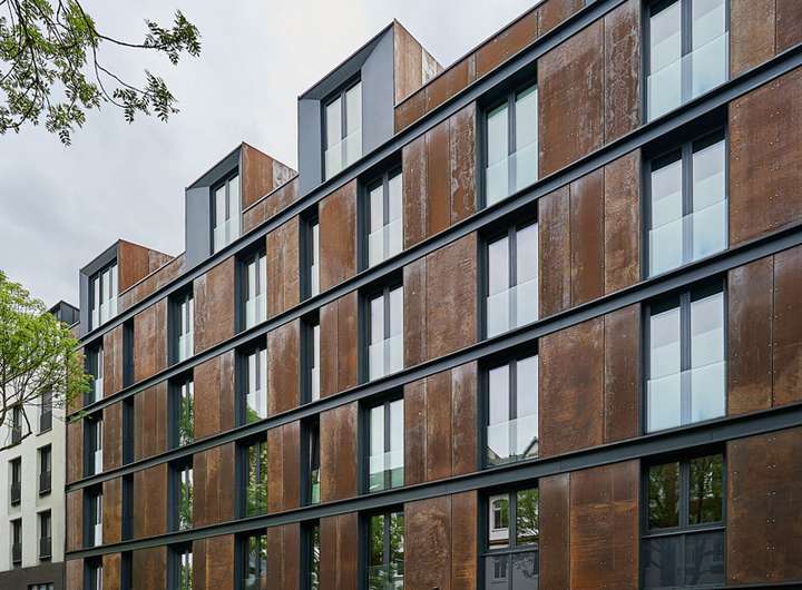 Der Neubau an der Dörnbergstraße bildet das Entrée in das angesagte „Wäschereiquartier“. Die Fassade aus Cortenstahl und der Sichtbeton im Innern bilden den Charakter der Einheiten und lehnen sich konzeptionell an den alten Industriecharme an.