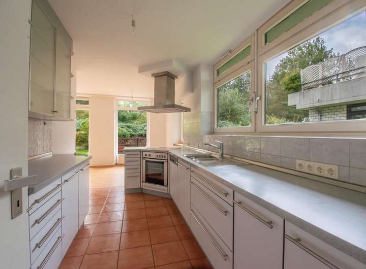 Diese Wohnung befindet sich in der beliebten Terrassenhaus-Wohnanlage. Über 32 Außen-Stufen gelangen Sie zur Wohnung, welche auf der Gartenebene gelegen ist. Sie bietet auf ca. 124 m² Wohnfläche eine durchdachte Raumaufteilung. Der Wohn- und Essbereich ist großzügig geschnitten und verfügt über bodentiefe Fenster, die für eine gute Belichtung sorgen und einen freien Blick in das angrenzende Naturschutzgebiet ermöglichen.