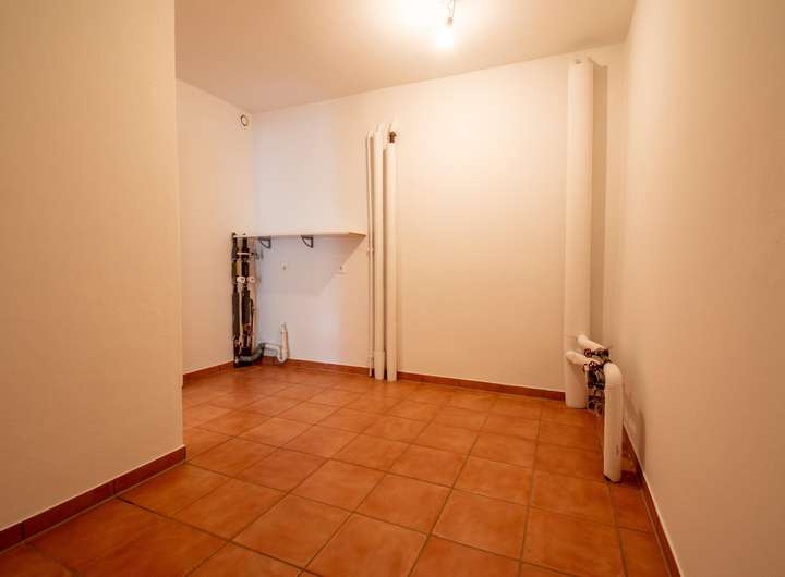 Die offen gestaltete Küche ist mit einer Einbauküche ausgestattet und fügt sich funktional in den Wohnbereich ein. Drei weitere Zimmer mit Größen von ca. 12 m², 12 m² und 16 m² bieten flexible Nutzungsmöglichkeiten, beispielsweise als Schlaf-, Kinder- oder Arbeitszimmer. Das Raumangebot wird durch ein Vollbad, ein separates Gäste-WC, eine Garderobe/Abstellraum sowie einen großzügigen Hauswirtschaftsraum ergänzt. Ein Außenabstellraum steht zusätzlich zur Verfügung.