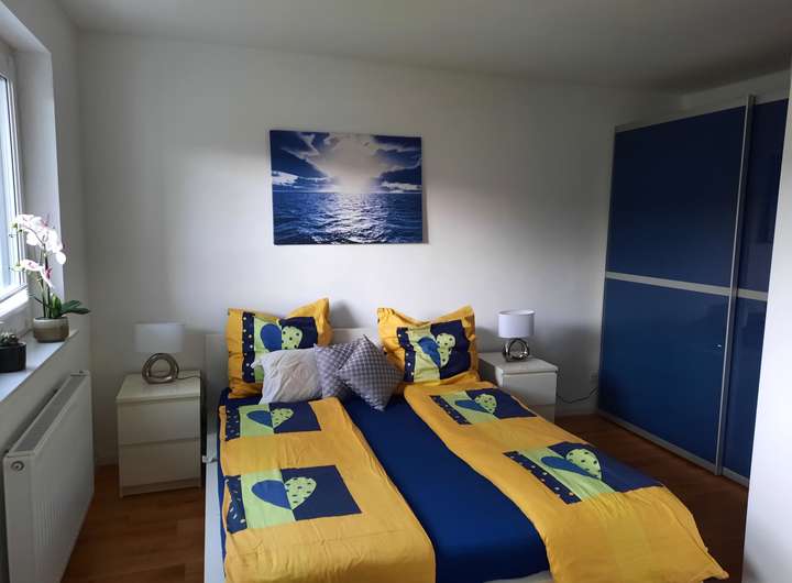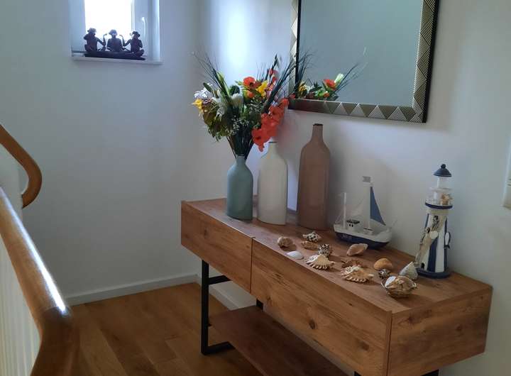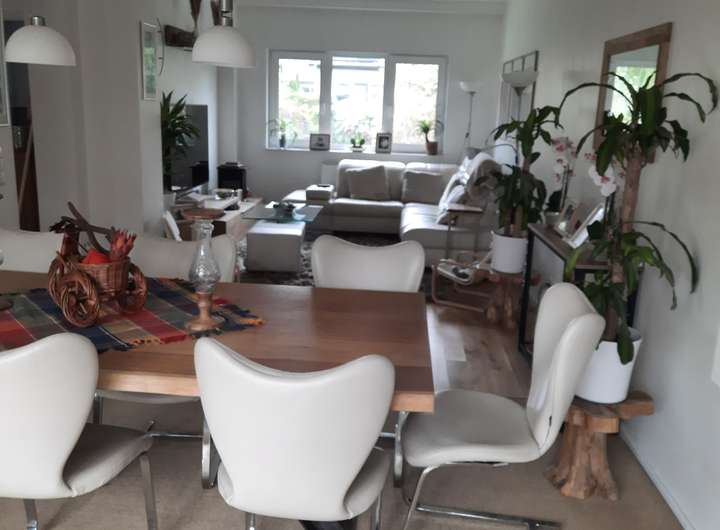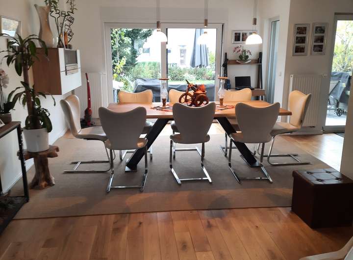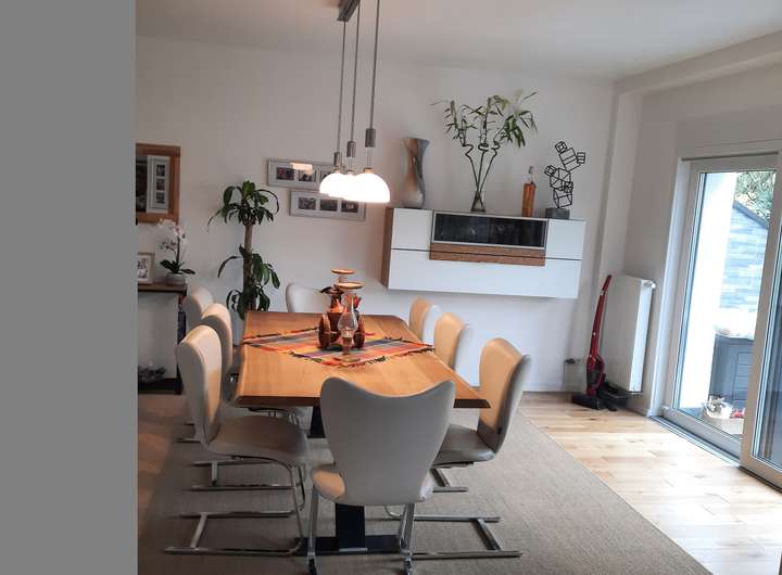 Das Erdgeschoss ist auf ca. 80 qm sehr offen gestaltet mit einladendem Eingangsbereich, einem Duschbad, einer offenen Küche mit Markengeraeten von Bosch. Die Küche ist zum großen Essbereich offen mit einem großen Esstisch aus massiver Eiche und 10 lederbezogenen Stühlen von Joop. Daran schließt sich die ca. 30 qm große Terrasse und der große Hauptgarten an. Der einladende Fernsehbereich hat ein elektrisches Ecksofa aus Leder von Joop und einen großen Fernseher.