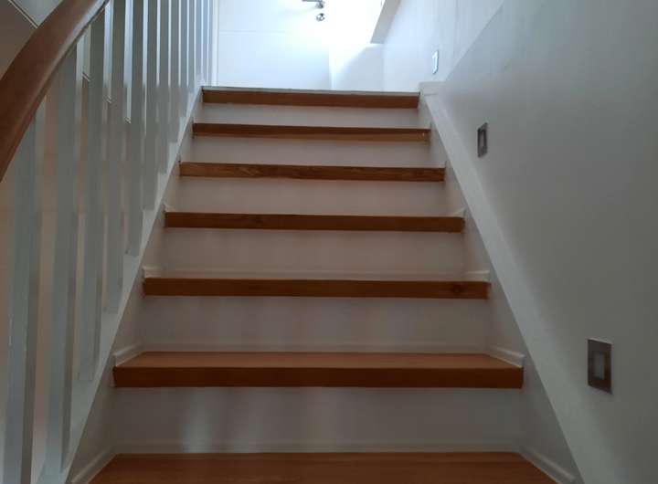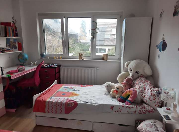 Im ersten Stock befinden sich 3 großzügige Schlafzimmer und ein Badezimmer mit Badewanne auf insgesamt ca. 80 qm. Das besonders große Hauptschlafzimmer hat weiterhin einen Balkon mit Blick auf den Hauptgarten. Im Flur befindet sich außerdem ein eigebauter Kleiderschrank.