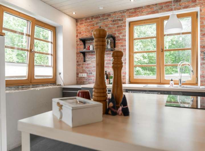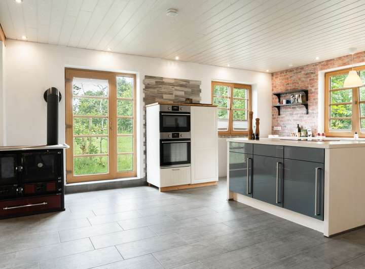 Helle, lichtdurchflutete Räume, zwei Badezimmer, eine moderne Küche und eine sonnige Terrasse verbinden funktionales Wohnen mit einer behaglichen, naturnahen Atmosphäre. Ein besonderes Highlight: der charmante Ofen im Wohn- und Essbereich – spendet nicht nur Wärme, sondern ermöglicht auch das Kochen direkt am Feuer.