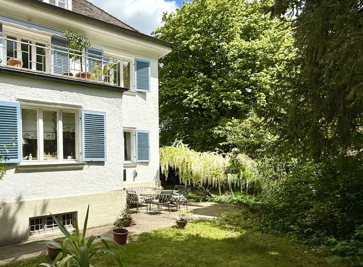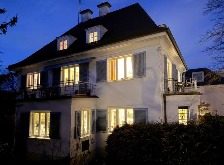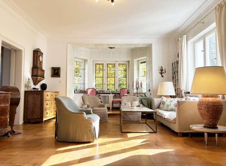 Die Liegenschaft (kein Denkmalschutz) mit ihren 10 Zimmern, die 1929/30 in qualitativ hochwertiger Bauweise errichtet wurde, ist geprägt von vielen erhalten gebliebenen historischen Details; bemalte Bleiglasfenster, originale Parkett- und Dielenböden, Türen mit eingesetzten Holzkassetten oder geschlienem Glas, dreiflügelige Kastenfenster, Deckenstuck sowie umfangreichen Maßeinbauten aus Holz (Treppe, Kassettendecke, raumhohe Bücherregale, Wandpaneele etc.), sorgen in allen Räumen für ein außergewöhnliches Wohlfühlambiente. Großzügige Deckenhöhen von bis zu 3 m und ein idyllischer Garten mit eingewachsener Bepflanzung runden den repräsentativen Charakter dieser selten schönen Villa ab.
