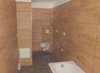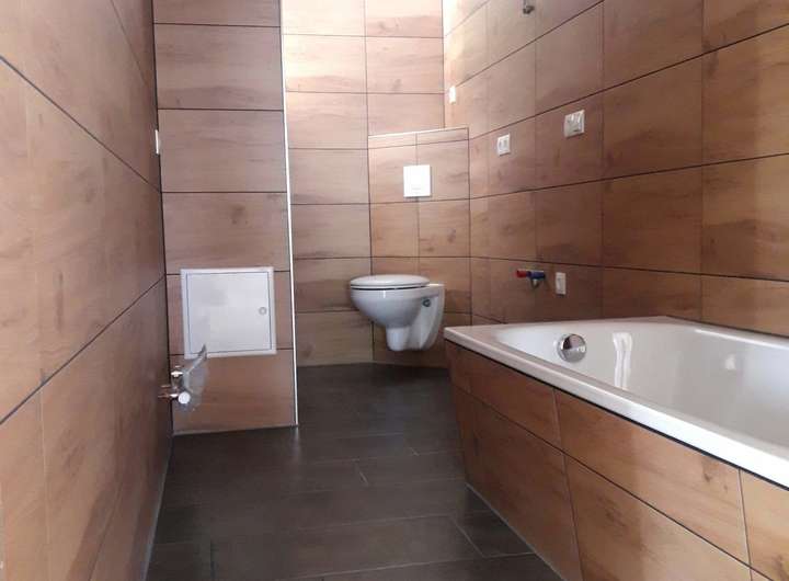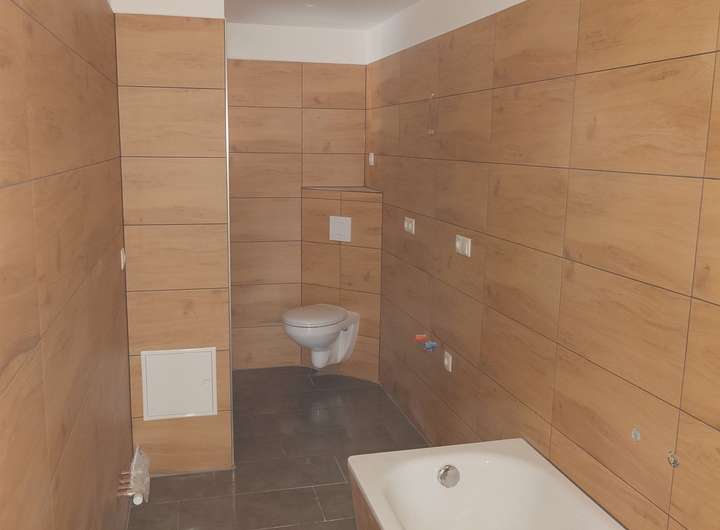 - Das geschmackvoll eingerichtetes Badezimmer ist mit einer Badewanne, Waschbecken und WC ausgestattet. Es besticht durch Fliesen in Bicolor-Optik, einer Fußbodenheizung, Handtuchheizkörper, Tageslicht und einen Waschmaschinenanschluss.
