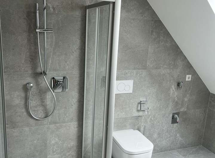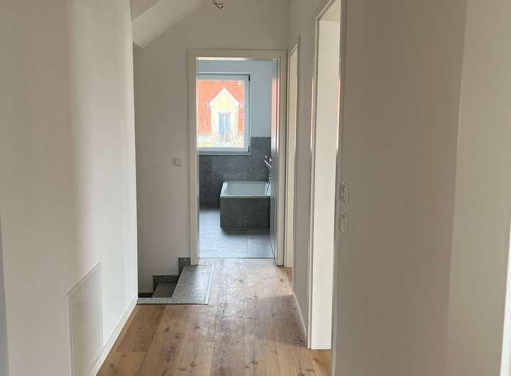 Im Obergeschoss befinden sich drei gut geschnittene Schlafzimmer, die mit viel Tageslicht durchflutet werden und genügend Platz für Ihre persönlichen Bedürfnisse bieten. Das moderne Tageslichtbad ist mit einer bodengleichen Dusche, Badewanne, Waschbecken und WC ausgestattet.