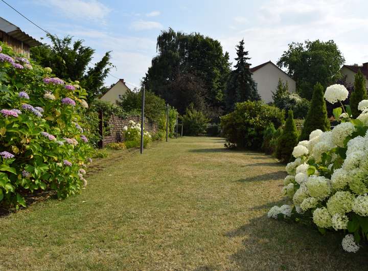 Der nach Süden ausgerichtete lange Garten ist vielfältig gestaltbar und weist genügend Platz zur Aufstellung von Kinderspielgeräte wie z. B. einem Trampolin oder einem Swimmingpool auf. Ein überdachter Sitzplatz im Hofbereich lädt zu einem entspannten Feierabend ein. Durch ein Tor gelangt man auf einen Weg des Nachbarhauses, welcher den direkter Außen-Zugang zum Garten gewährleistet.