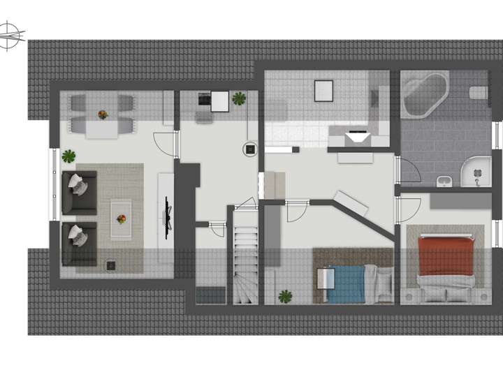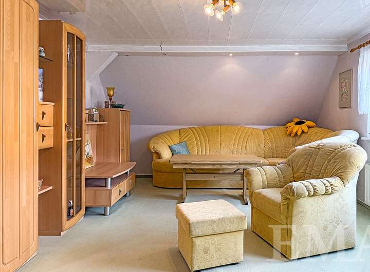 Im Dachgeschoss befinden sich ein Wohnbereich, zwei weitere Zimmer, eine Küche, ein Badezimmer mit Dusche und Badewanne, ein Flur sowie ein weiterer kleiner Flur. Die Wohnfläche im Dachgeschoss beträgt ca. 72 m².