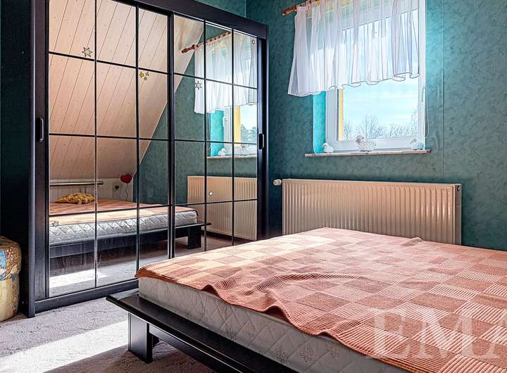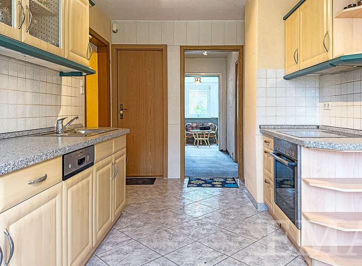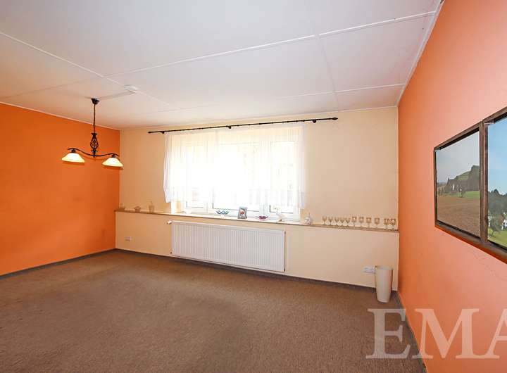 Im Erdgeschoss befinden sich ein Wohnbereich, ein großes Zimmer, ein weiteres Zimmer, eine Küche mit Einbauküche, ein Badezimmer mit Badewanne, eine Veranda, ein kleiner Flur sowie eine Diele mit einer Treppe in das Dachgeschoss. In der Küche führt eine Treppe in den Teilkeller. Die Wohnfläche im Erdgeschoss beträgt ca. 91 m².
