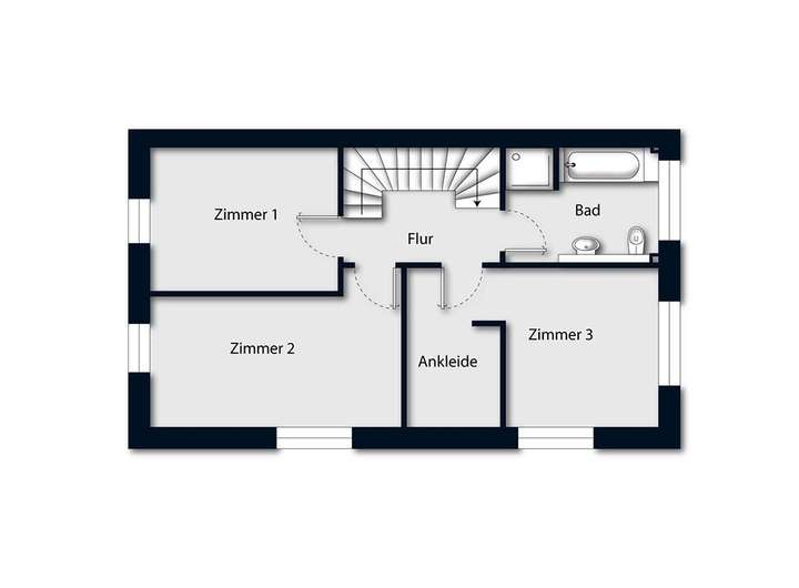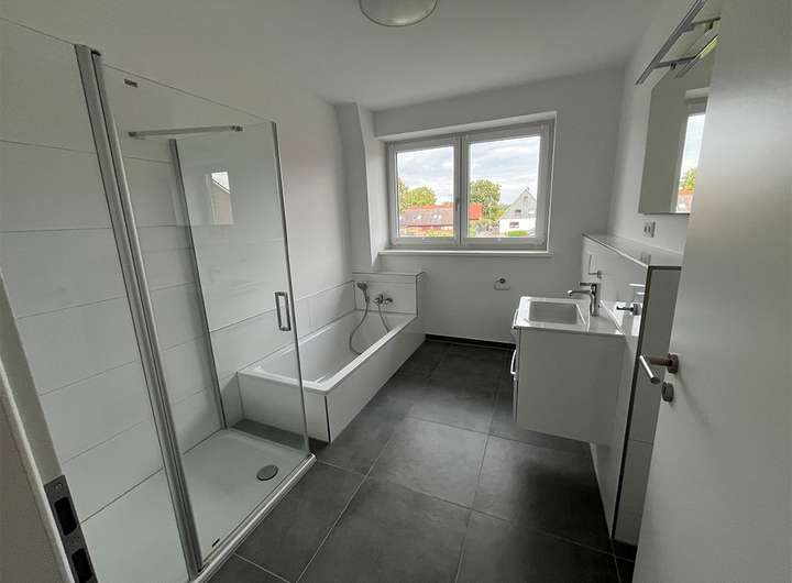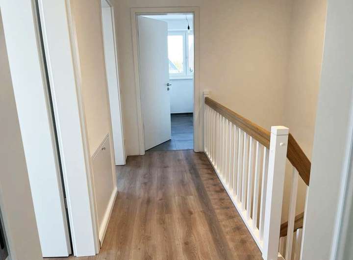 Eine massiv ausgeführte Eichenholztreppe führt ins Obergeschoss. Dort befinden sich drei gut geschnittene Zimmer, die flexibel als Schlaf-, Kinder- oder Arbeitszimmer genutzt werden können. Das Tageslichtbad ist hochwertig ausgestattet und verfügt über eine bodengleiche Dusche, eine Badewanne, moderne Armaturen sowie einen Unterschrank mit Waschtisch.