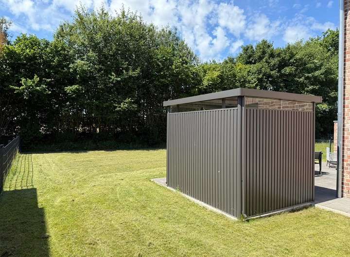 Der Außenbereich ist pflegeleicht und funktional angelegt. Zwei Stellplätze befinden sich direkt am Haus, einer davon mit vorbereiteter E-Lademöglichkeit. Eine gemauerte Trennwand zum Nachbarhaus sorgt für ein hohes Maß an Privatsphäre.