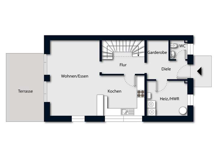 Ergänzt wird das Raumangebot im Erdgeschoss durch ein Gäste-WC sowie einen funktionalen Hauswirtschaftsraum mit direktem Zugang zum Außenbereich.