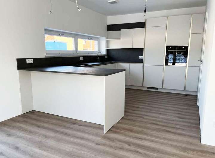 An den Wohnbereich grenzt die offene, hochwertige Einbauküche, die mit grifflosen Fronten, moderner Technik und klarer Linienführung überzeugt. Ausgestattet ist sie mit einer Kühl-Gefrierkombination, einem Geschirrspüler, einem hochwertigen Backofen sowie einem Induktionskochfeld mit integriertem Dunstabzug.