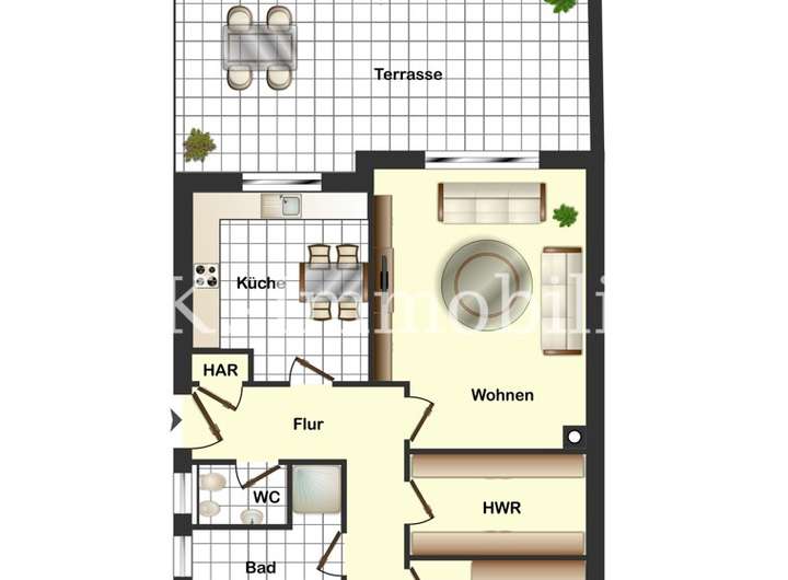 Eingangsbereich, Technik, Gäste WC mit Urinal, HWR, Küche, Wohnzimmer mit Zugang zur Terrasse, 2 Schlafräume, 1 Badezimmer mit ebenerdiger Dusche