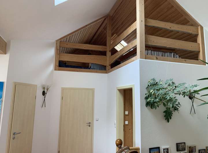 Der große hohe und offene Galerieraum, der sich gemütlich einrichten lässt, liegt über der Treppe zur nächsten Ebene vor. Die Schlafräume sind von hier aus zugängig.