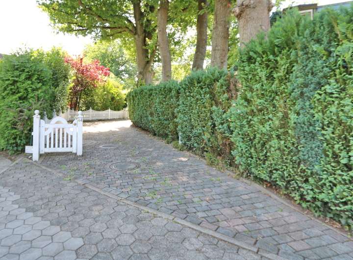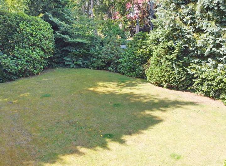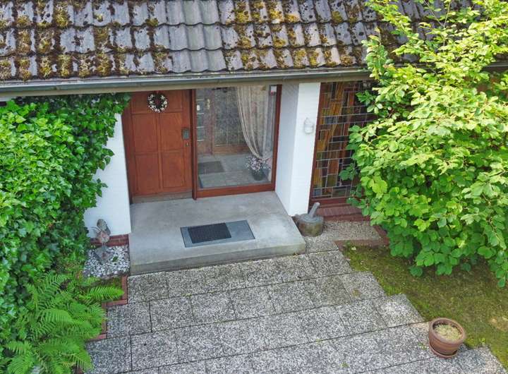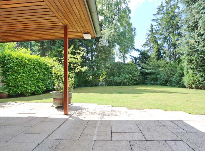 Die teils überdachte, große Terrasse lädt zum Verweilen und Entspannen im Freien ein, während umgebende Hecken sowie Büsche und Sträucher für ein hohes Maß an Privatsphäre sorgen.