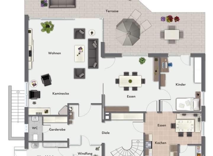 Das Erdgeschoss empfängt Sie mit einem einladenden Windfang, der in eine großzügige Diele mit offener Rundtreppe und elegantem, geschmiedetem Geländer führt. Der geräumige Wohnbereich mit Kaminecke schafft eine behagliche Atmosphäre, und der offene Durchgang zum Essbereich öffnet den Raum zusätzlich. Die Einbauküche verfügt zudem über eine Essdiele und bietet Zugang zu einem Hauswirtschaftsraum sowie einem Arbeitszimmer. Ein Gäste-WC liegt praktischerweise neben der Garderobe neben dem Dielenbereich am Eingang. Zusätzlich dient ein Wasch-/Putzraum mit separater Eingangstür eine Art Schleuse zum Windfang.