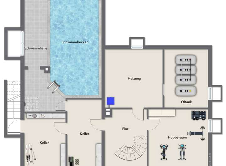 Der Vollkeller umfasst einen Hobbyraum und zusätzliche Abstell- und Lagerräume, die vielseitig genutzt werden können. Ein besonderes Highlight des Hauses ist das integrierte Schwimmbad mit angrenzender Dusche, das sowohl Erholung als auch Aktivität im eigenen Zuhause ermöglicht. Ebenfalls befindet sich der Heizungsraum und der Öltank im Kellerbereich. Zwei Außenzugänge bieten den Zugang zum seitlichen Bereich nach draußen.