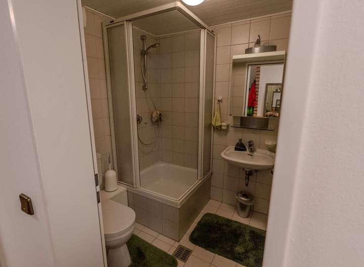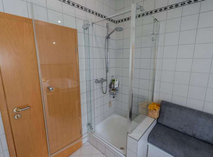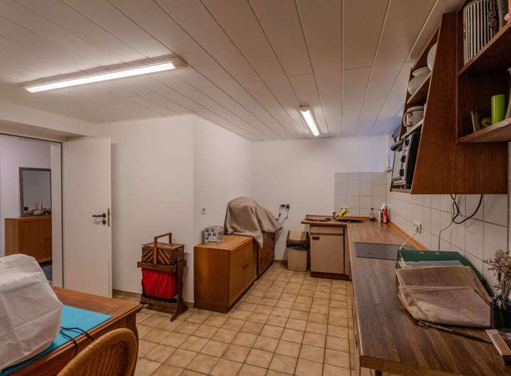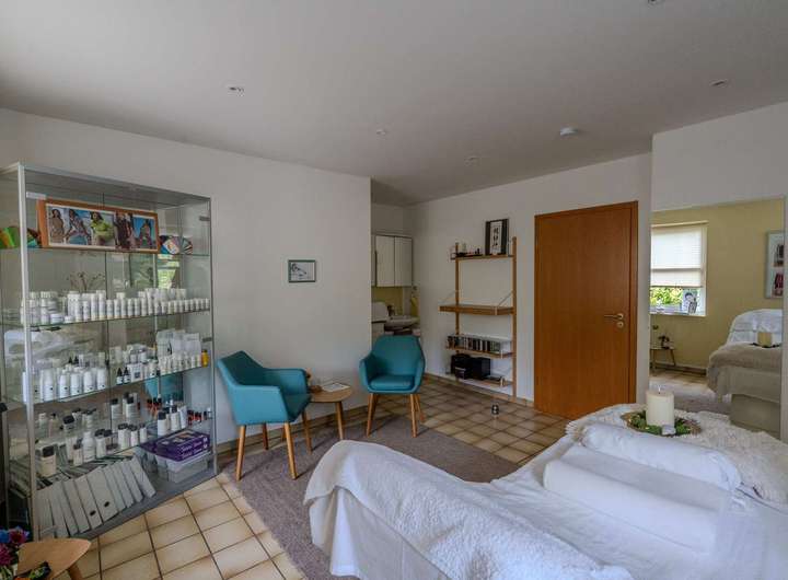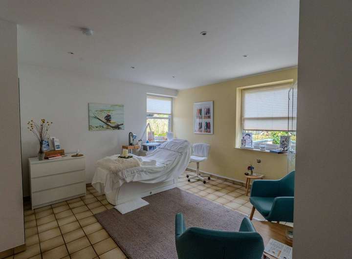 Die im Erdgeschoss gelegene Einliegerwohnung wird derzeit gewerblich genutzt und besteht aus einem freundlichen Wartebereich, einem Behandlungsraum mit Wasseranschluss sowie einem modernen Badezimmer. Dank dieser Ausstattung eignet sich die Einheit ideal für Dienstleistungsberufe wie Kosmetik, Physiotherapie oder Beratung.