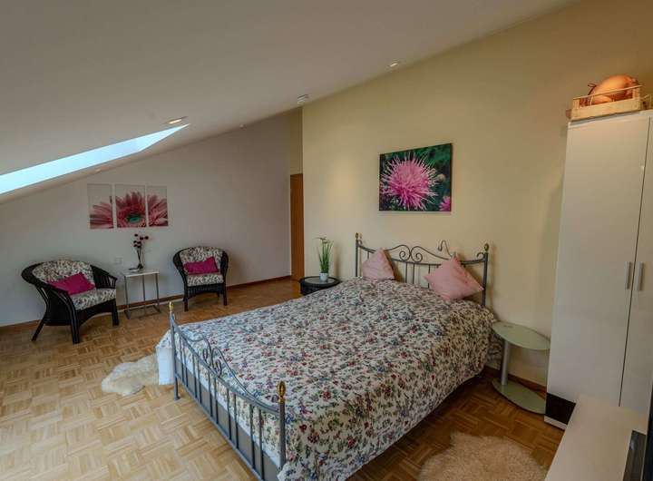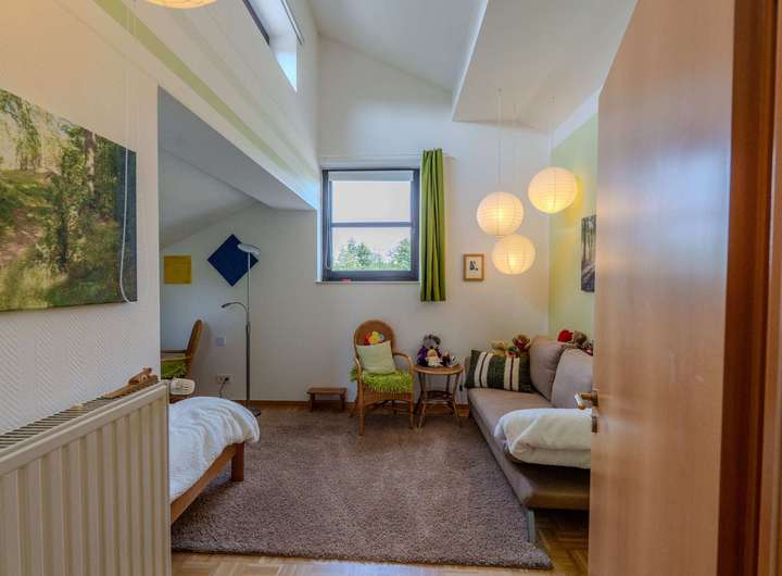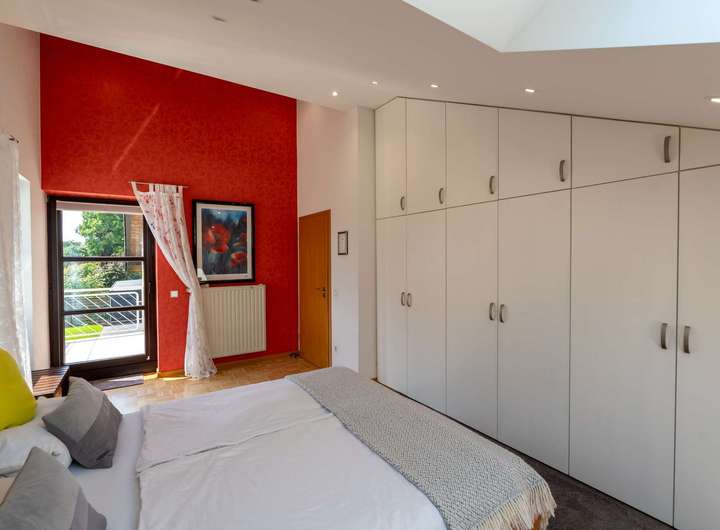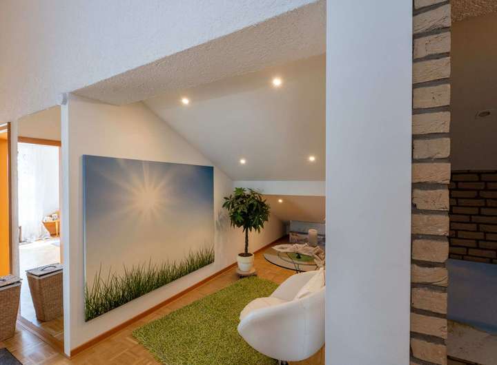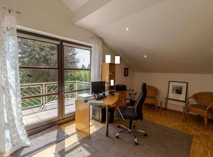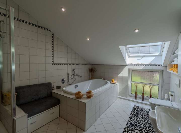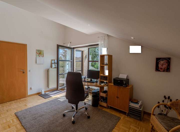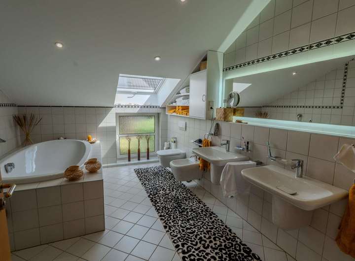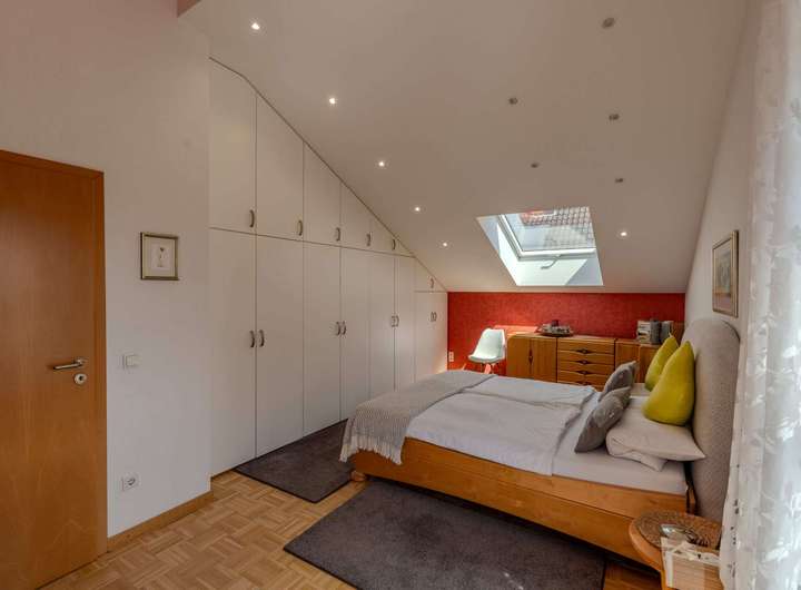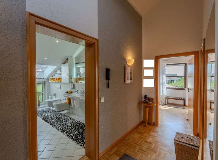 Im Wohnbereich erwartet Sie im Obergeschoss eine offene, lichtdurchflutete Bauweise, die bis in die Dachspitze reicht und dem Wohnraum ein luftiges und modernes Ambiente verleiht. Vier Zimmer stehen hier zur Verfügung, zwei davon mit direktem Zugang zum Balkon und Blick in den gepflegten Garten. Das stilvolle Badezimmer ist mit einer XL-Badewanne, einer Dusche sowie zwei Waschtischen ausgestattet. Der durchgängig verlegte, makellose Parkettboden unterstreicht die hochwertige Wohnatmosphäre.
