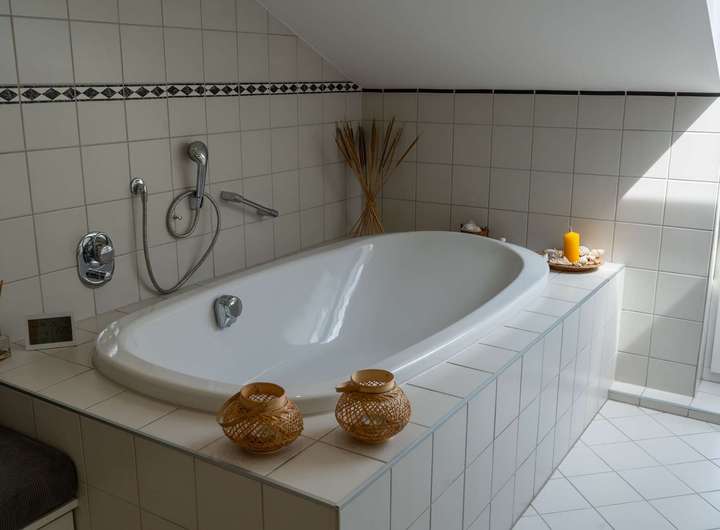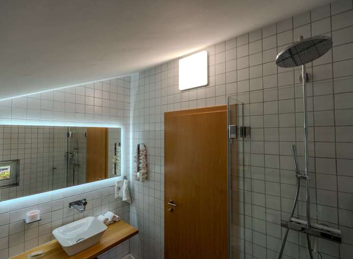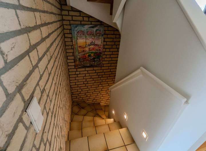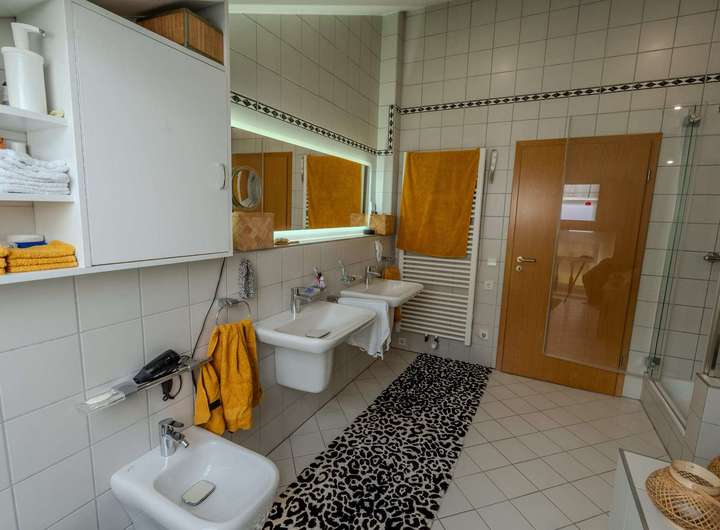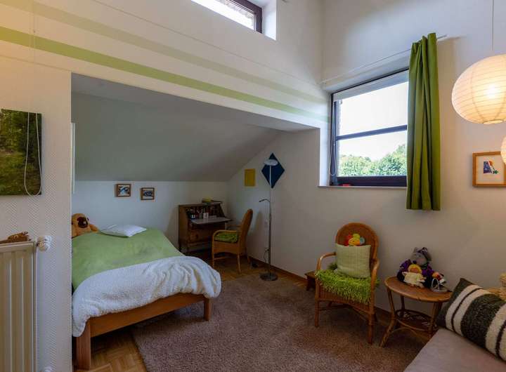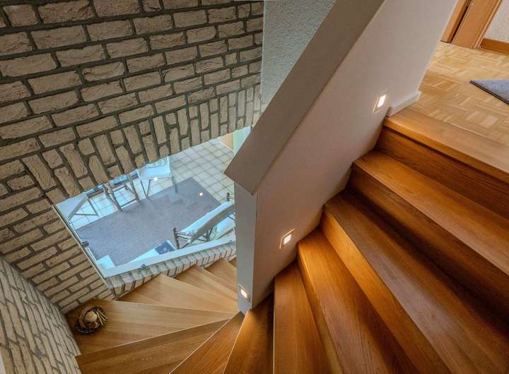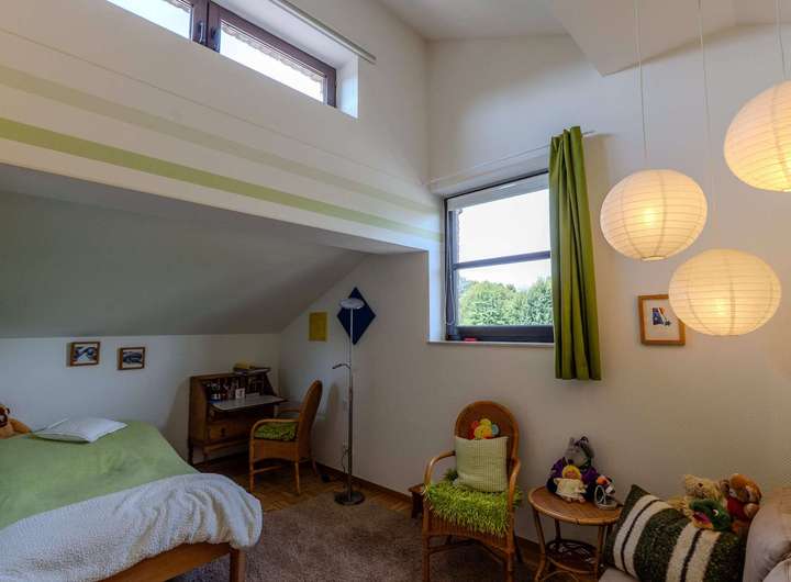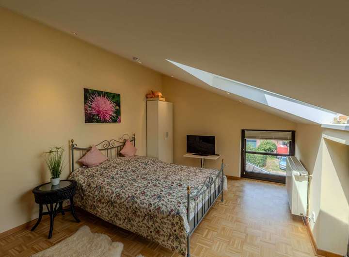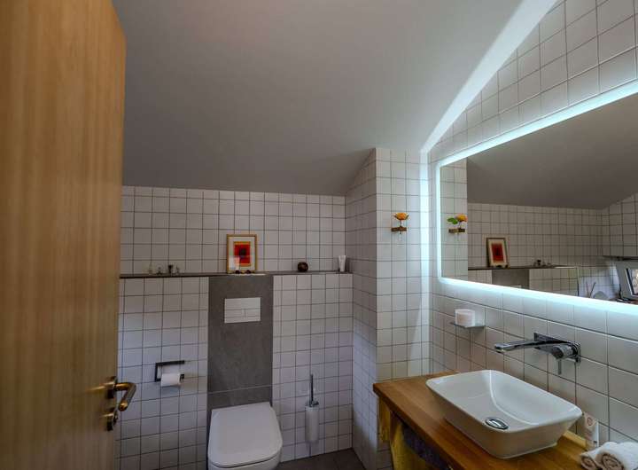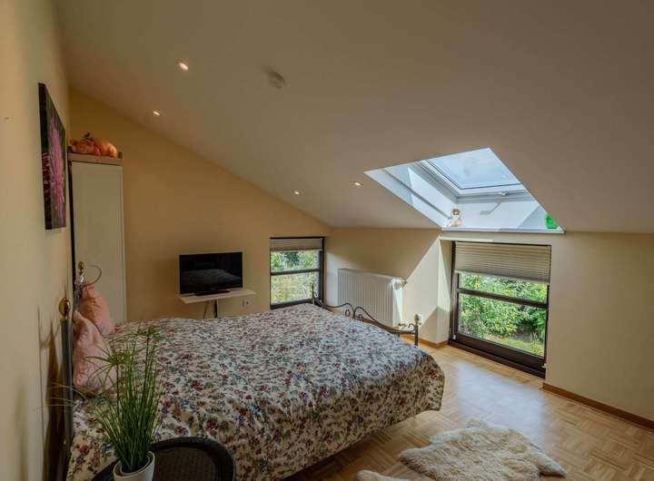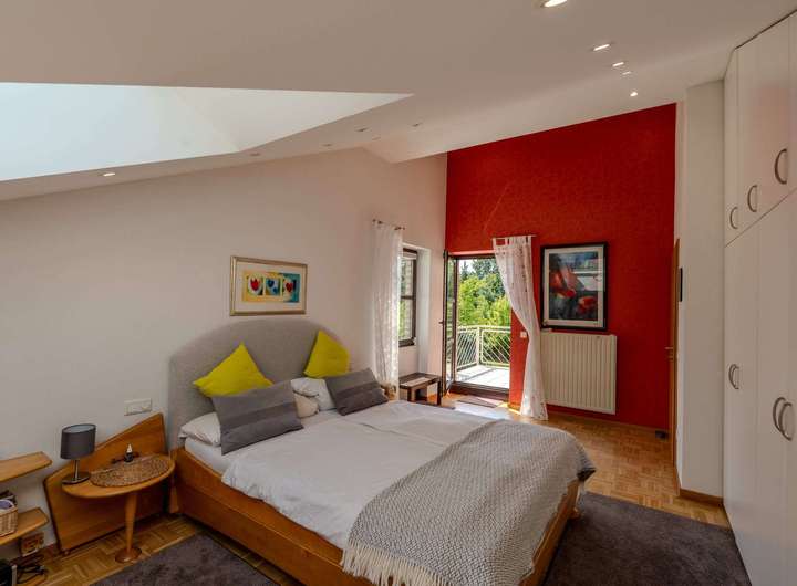 Im Wohnbereich erwartet Sie im Obergeschoss eine offene, lichtdurchflutete Bauweise, die bis in die Dachspitze reicht und dem Wohnraum ein luftiges und modernes Ambiente verleiht. Vier Zimmer stehen hier zur Verfügung, zwei davon mit direktem Zugang zum Balkon und Blick in den gepflegten Garten. Das stilvolle Badezimmer ist mit einer XL-Badewanne, einer Dusche sowie zwei Waschtischen ausgestattet. Der durchgängig verlegte, makellose Parkettboden unterstreicht die hochwertige Wohnatmosphäre.